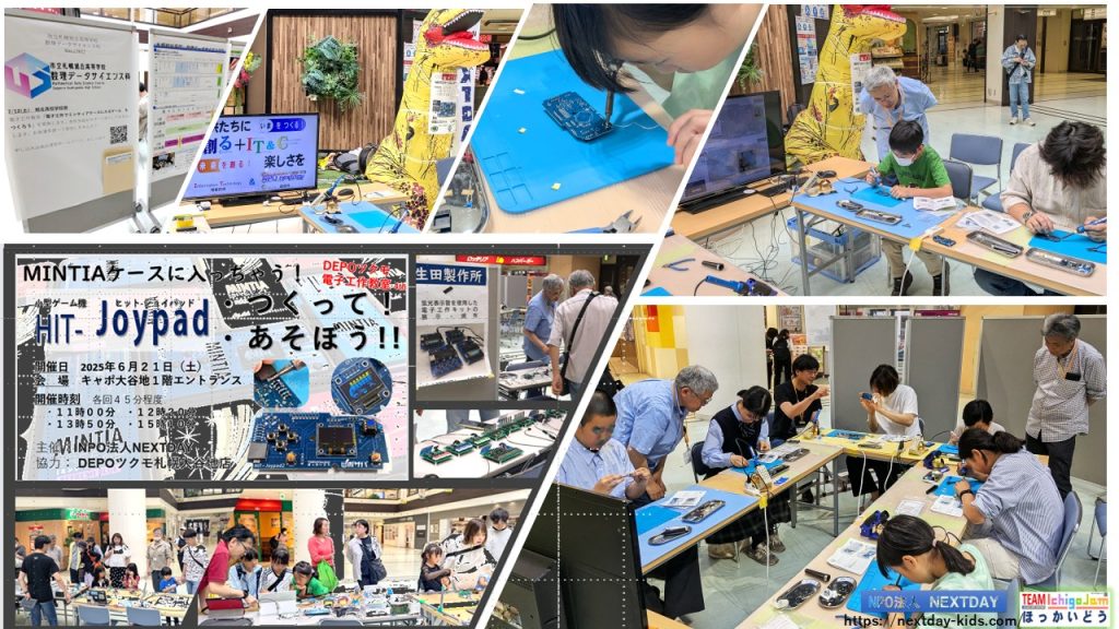 札幌市大谷地にあるCAPO大谷地のエントランスホールで、ゲーム機をはんだ付けして製作する電子工作教室を開催しました。
